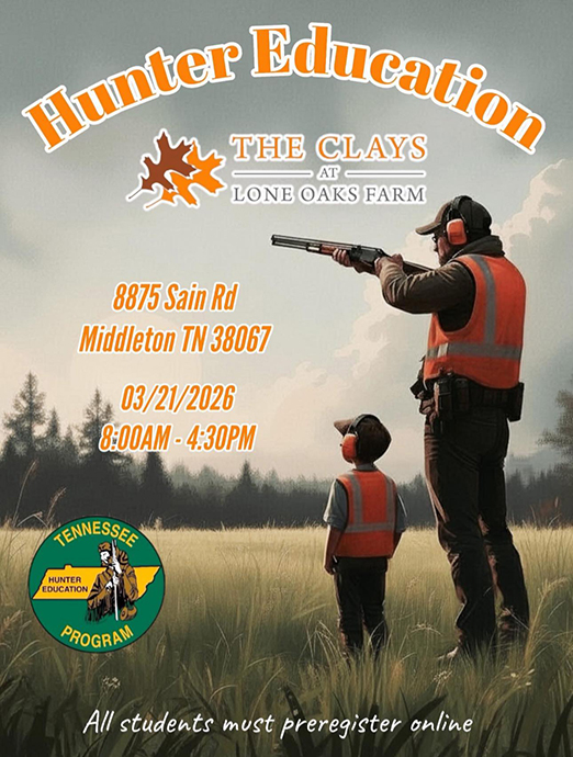 A Hunter Education course will be offered at The Clays at Lone Oaks Farm on Saturday, March 21, 2026. The course will be taught by Hardeman County Game Warden Jacob Jones. The main goal of the course is to teach responsible hunting skills, which Warden Jones believes is essential for all people practicing the sport.